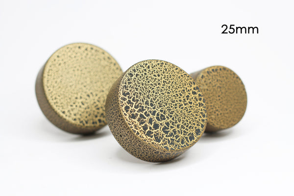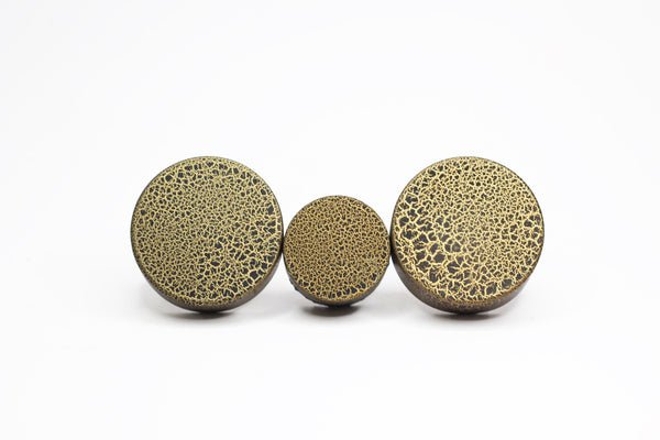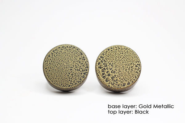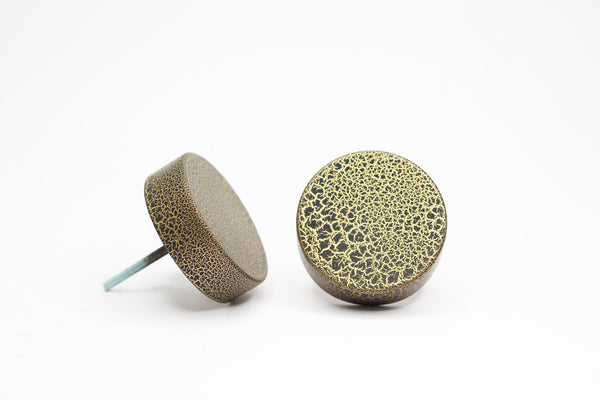 Concrete cabinet knob in the shape of a circle/disc with a two-colour "crackle" effect. These knobs are flat and they're elevated from the drawer front/door by means of a special steel nut/bar (included) as pictured. This nut is about 9mm.