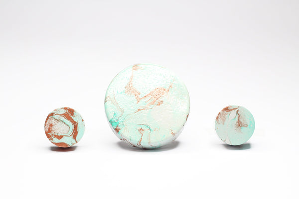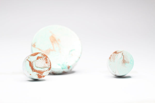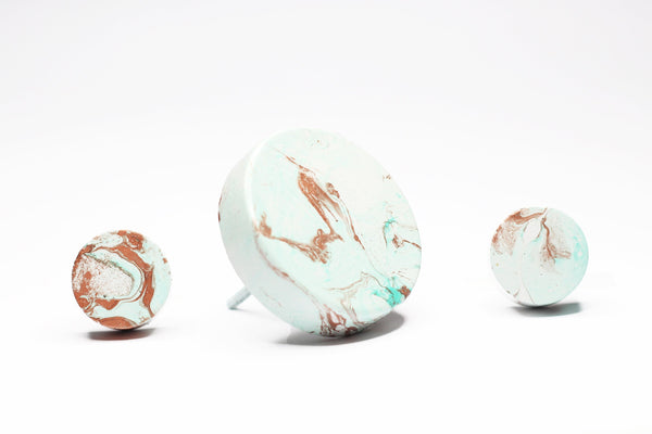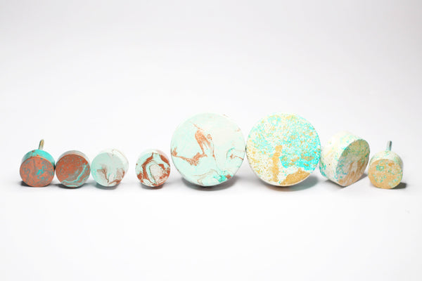 Concrete cabinet knob in the shape of a circle/disc in beautiful Greens, White & Copper Effect. These knobs are fully painted with a special method using a number of colours. No two items will result in the same look. Pictured are examples. You will receive a hook created with the same colours but the way the colours mix cannot be controlled. The items are slightly textured. They are flat and they're elevated from the wall by means of a special steel nut/bar (included) as pictured. This nut is about 12mm.