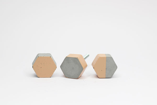Concrete cabinet knob in the shape of a hexagon.