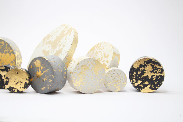 A round cabinet knob decorated with a genuine 23k gold leaf. The knobs can be grey, white, black or otherwise pigmented concrete. Available in 5 sizes.