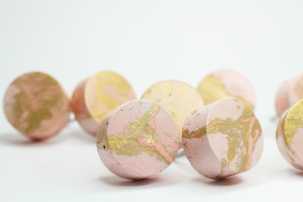 Unique cabinet knobs in a rose & gold finish created through hydro-dipping. These round knobs are flat and they're elevated from the drawer front/door by means of a special steel nut/bar (included) as pictured. This nut is about 10mm.