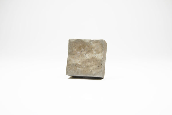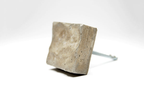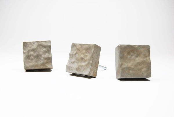 Concrete cabinet knob in the shape of a square with a texture of water waves on its face. These knobs are flat and they are elevated from the drawer front/door by means of a special steel nut/bar (included). This nut is about 10mm.