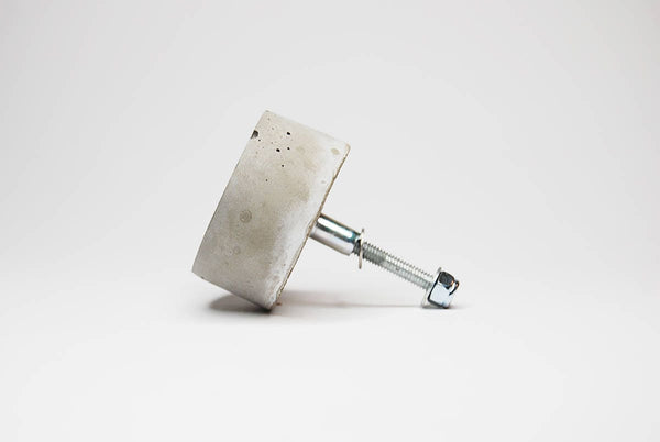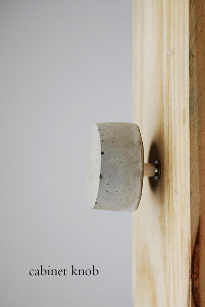 Concrete cabinet knob in the shape of a circle/disc. These knobs are flat and they're elevated from the drawer front/door by means of two nuts (included) as pictured.