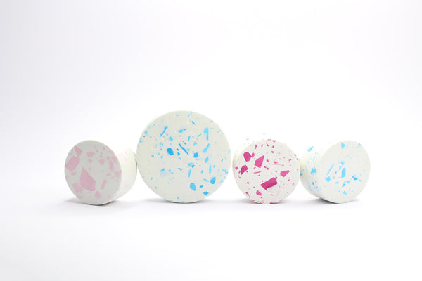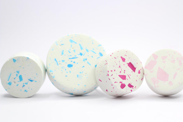 Concrete cabinet knob in the shape of a circle/disc in beautiful Terrazzo Effect. These knobs are made from white concrete with cement chips in another colour. A mix of different colour chips is also possible. No two items will result in the same look. Pictured are examples. These items are flat and they're elevated from the cabinet door/drawer front by means of a special steel nut/bar (included) as pictured. This nut is about 12mm.