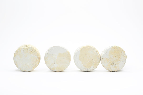 Concrete cabinet knob in a rough shape of a circle/disc in a style resembling travertine. They have a beautiful raw and rustic look and feel due to their natural irregular shape and rough texture. They are created by layering small amounts of white and sand-coloured concrete without stirring, tapping or otherwise smoothing the mix. They cure and dry a little like lava, small chunks joined together but not mixed creating the signature texture. All items are varnished matt.