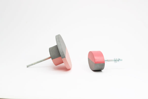 Extra large oval concrete cabinet knob. Choose between white, grey and black concrete and a wide variety of paint colours and finishes. These knobs are flat with thin fronts. The "base" that elevates them from the drawer front/cabinet door is also concrete and it contains a threaded insert into which a bolt is screwed from the other side so that no nuts are needed on the inside. These knobs are elevated from the drawer front/door by about 25mm.