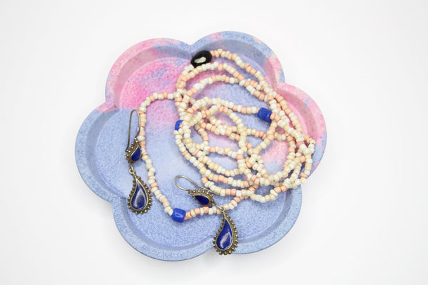 A beautiful purple and pink marble tray perfect for any trinkets. Can be used as a catchall for jewellery, keys or as a desk organiser. 12cm in diameter it is big enough to support a small succulent plant pot or a candle. Made from genuine concrete, it is heavy and sturdy and has a base of natural cork (not pictured yet). We cure our items over a prolonged time and then seal them with natural wax for a beautiful shine and water resistance. This listing is for a purple and pink dish. Any colours are available, please feel free to ask.