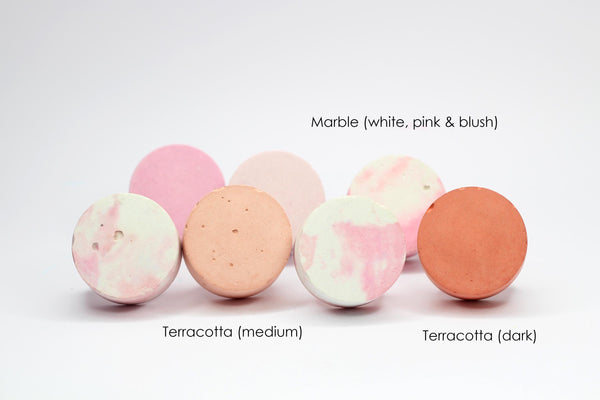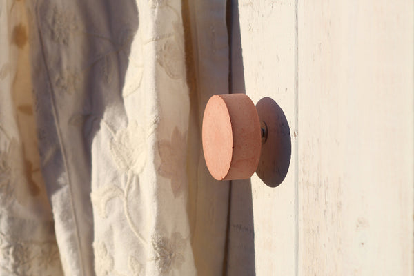 Minimalist pigmented concrete cabinet knobs in the shape of flat discs. Chunky but sleek, they come in a beautiful pastel range, from light to vivid shades. Sealed unobtrusive matt or gloss if you choose this bolder version. Bespoke hues are possible. These knobs are flat and they're elevated from the drawer front/door by means of a special steel nut/bar (included) as pictured. This nut is about 9mm.