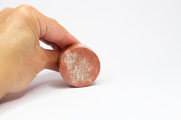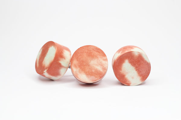 Concrete cabinet knob in the shape of a circle/disc. Various terracotta and marble styles to choose from! Please see photos. These knobs are flat and they're elevated from the drawer front/door by means of a special steel nut/bar (included) as pictured. This nut is about 9mm.