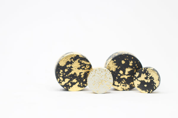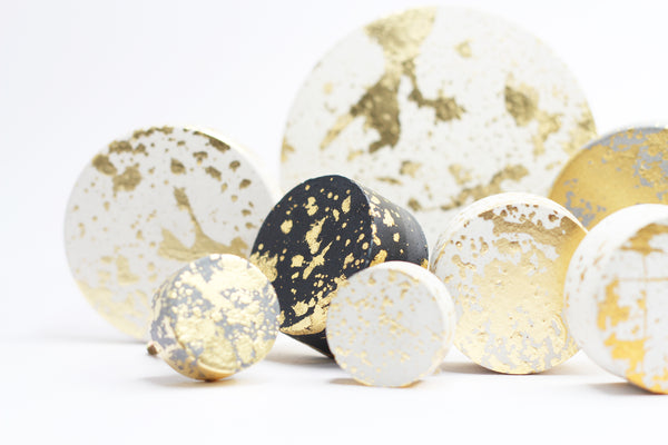 A round wall hook with an imitation gold, silver or copper leaf finish. The hook can be grey, white, black or otherwise pigmented concrete. Available in 5 sizes.