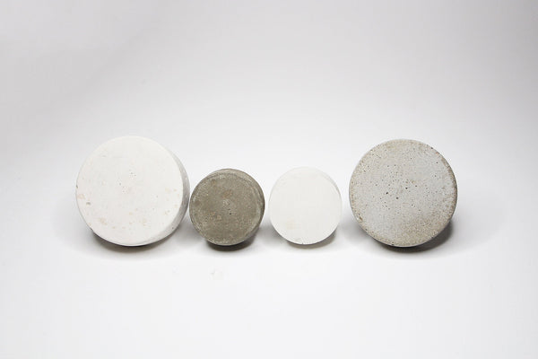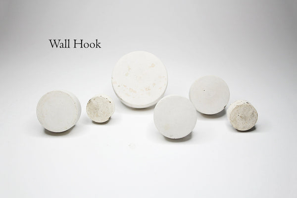 Wall hook hand made from white concrete in the shape of a circle/disc. Available in plain natural white concrete (off-white) or half-painted. These hooks are flat and they're elevated from the wall by means of a special steel nut/bar (included) as pictured. This nut is about 12mm.