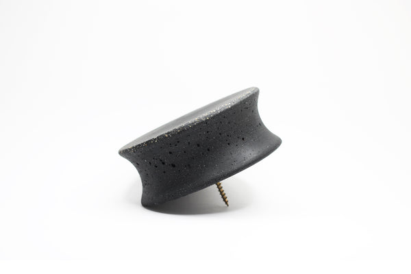 A large round wall hook made from concrete. 5" in diameter and 2" thick, it is certainly a statement item, decorative as well as practical. This hook is round and flat and fits flush to the wall but its sides are concave. The hook is very heavy and very sturdy and comes in a very wide variety of colours and finishes to fit in with your style.